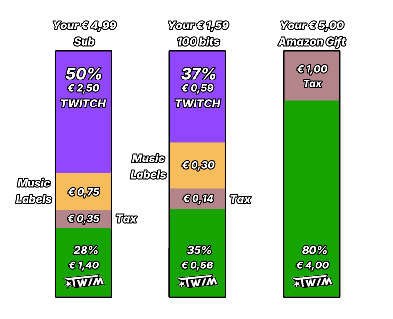 Here’s how your € 4.99 Twitch sub is actually split up so you know where your money goes:Twitch keeps 50% that means about € 2.50 goes to Twitch!I receive 50% → around € 2.50 comes to me!